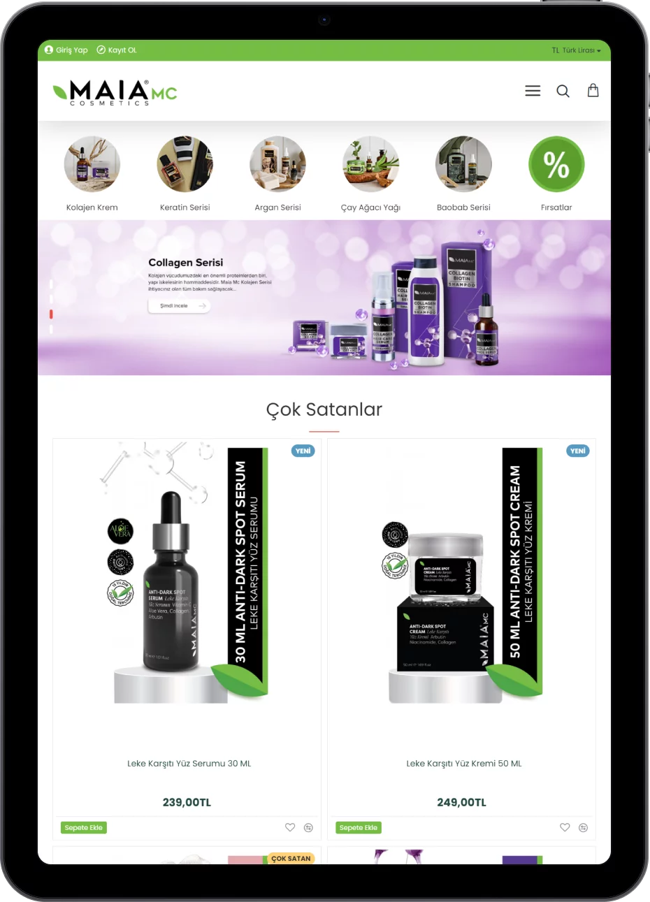 Maia MC markasının kurumsal kimliğine uygun e-ticaret web tasarım çalışması yapılarak, dijitalleşme sürecine başlangıç yapılmıştır. Sağladığımız SEO uyumlu e-ticaret altyapısı ile arama motorlarında (Google, Yandex, Bing) ürünlerin görünürlüğü artırılmıştır.